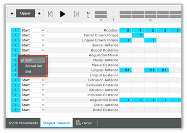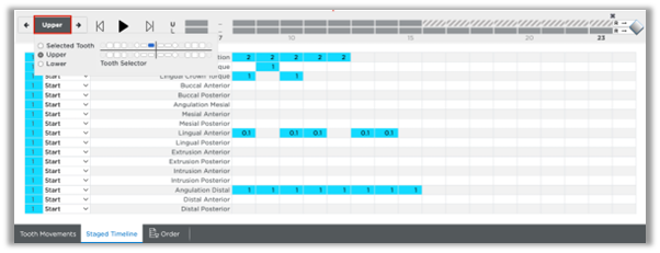 You can also view the movements by tooth. Switch between the upper or lower arch at the top left of the Staged Timeline tab.