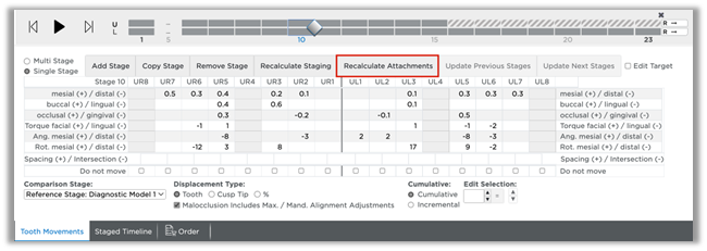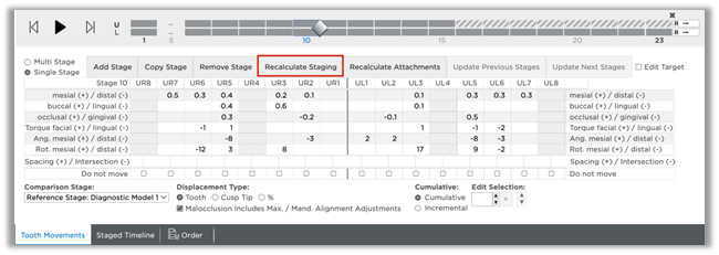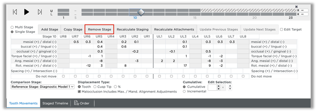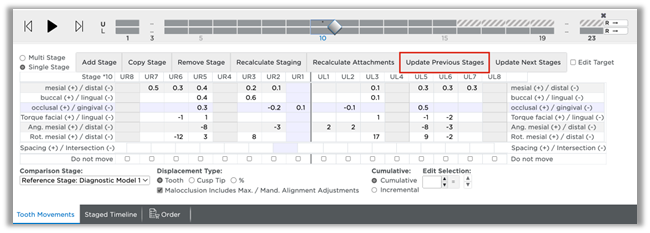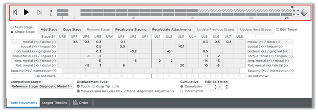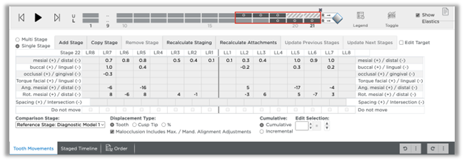 When this area first appears, the tooth movement values are displayed as cumulative amounts and the R stage is selected. It contains the total tooth movements. You have many options for viewing tooth movements to ensure that the values are appropriate.