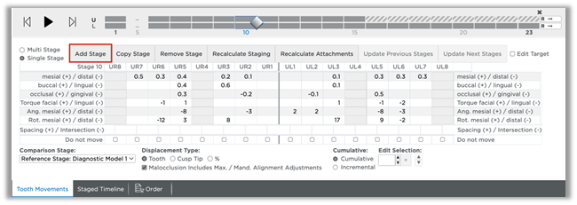 - Click the Add Stage button to insert a new stage. The tooth movements for the new stage are set to a midpoint between the preceding stage and the following (new) stage.