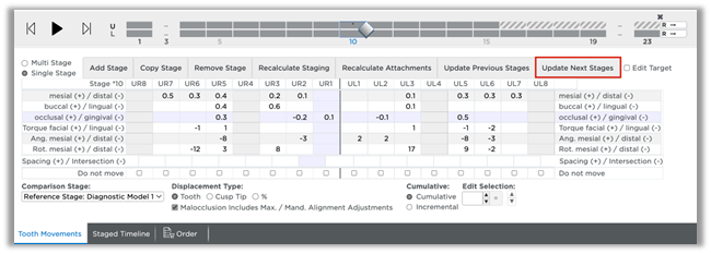 - Cumulative – The tooth movements of each stage are added together to show the total movement planned through the current stage.