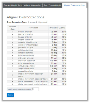 Overcorrection can be applied to the staged model sequence. You can specify in your Preferences how many Overcorrection stages to apply as well as thresholds for particular movements.