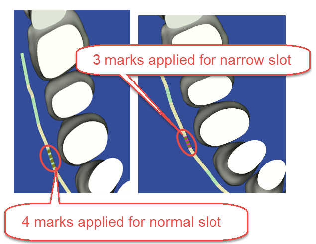 The laser marks (outer pair on uppers) on the wires correspond to ends of the straight wire segments. When you place a SureSmile wire, ensure that the brackets are inside of these marks. If your treatment plan includes space closures or a shift, consider the movement of the brackets and place the wire to accommodate that movement.