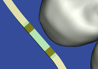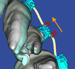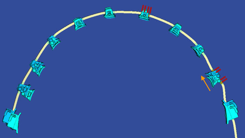You can view the planned locations of the laser markings on wires directly in the model. This is helpful when inserting wires, especially with patients with substantial midline shifts. With these patients you can directly refer to the finished wires in SureSmile and use the 3D model to determine how the wires should be inserted.
